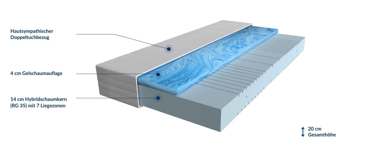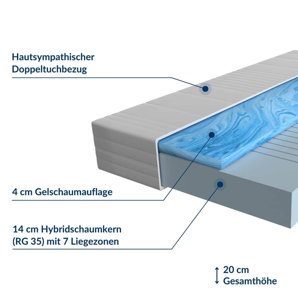 - 14 cm hoher 7-Zonen-Hybridschaumkern (RG35) mit ergonomischem 2D-Konturschnitt