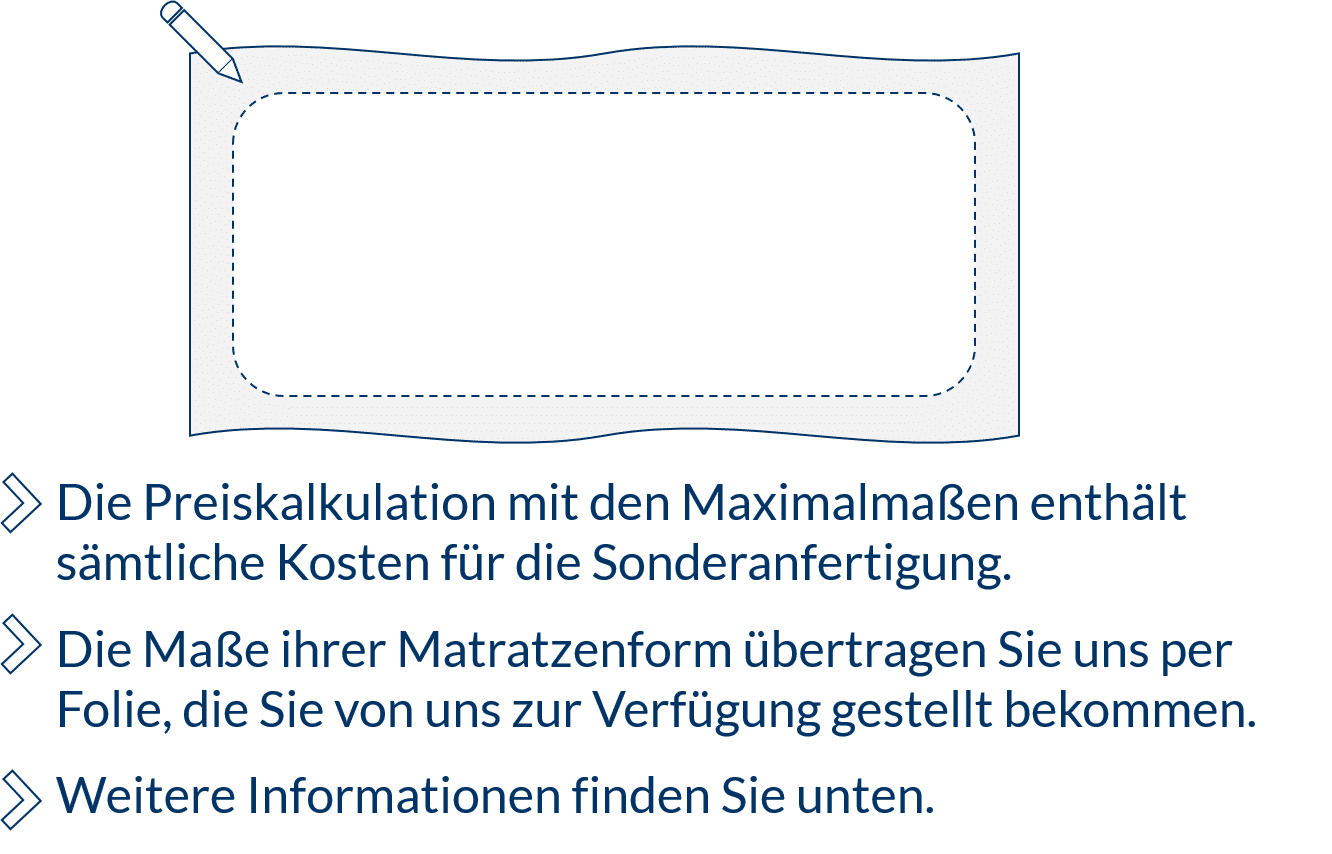Sie haben Ihre gewünschte Form nicht gefunden? Das ist kein Problem. Klicken Sie hier, um ihre passgenaue Matratze anfertigen zu lassen.